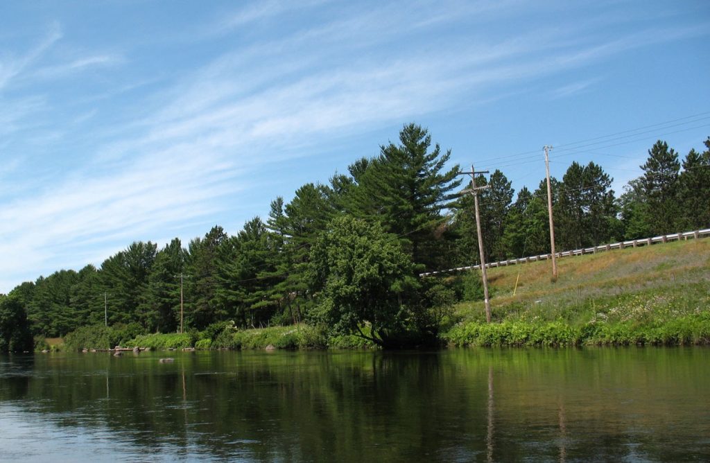 At the place shown in the photo to the right, the 10-foot wide asphalt trail will pass between the pines and the river. That would be the Wisconsin River, This spot is only about 20 miles from the river's headwaters at Lac Vieux Desert, one of our county's 1,300 lakes!